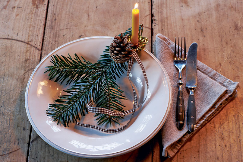 Тарелку для рождественских блюд украшает лишь веточка ели. Зафиксируйте на ней шишку проволокой, привяжите подходящую ленту и закрепите на тарелке держателем для елочных свечек.