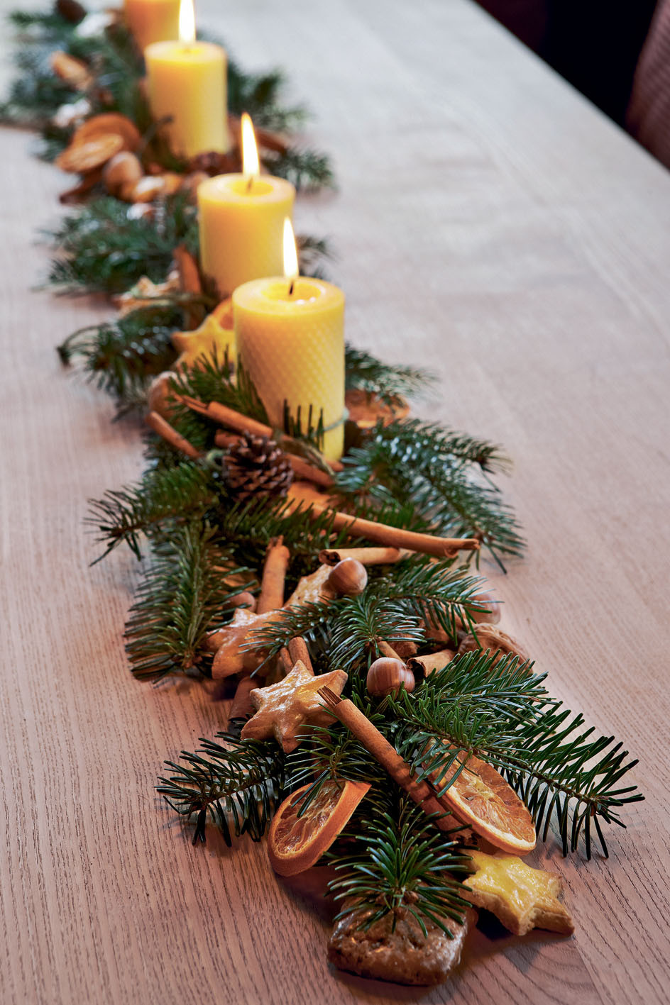 Настольная гирлянда. Свечи на основании поставьте в ряд в середине стола. Сделайте гирлянду из еловых веток, шишек, печенья, орехов, палочек корицы и сушеных апельсиновых долек.