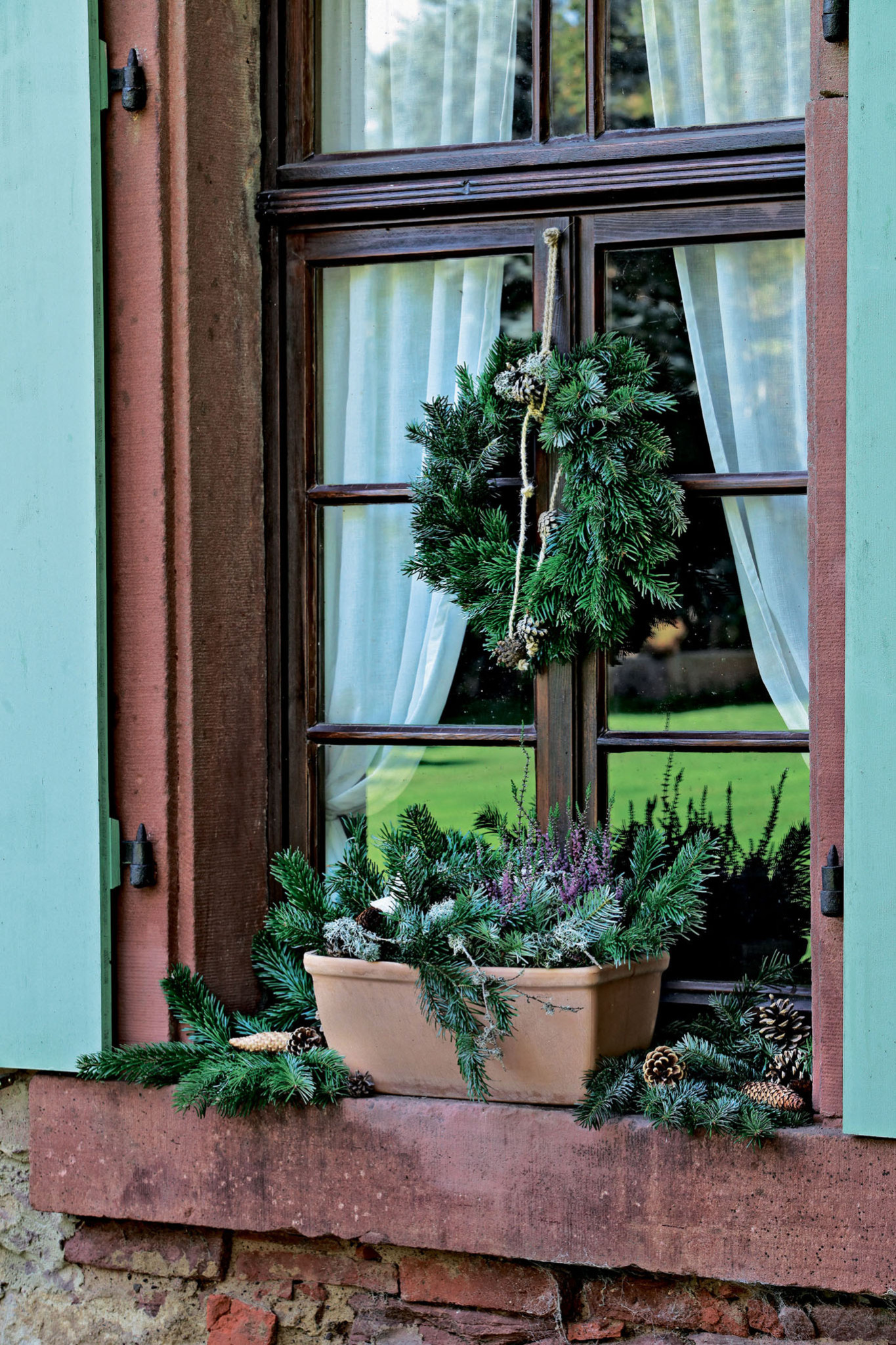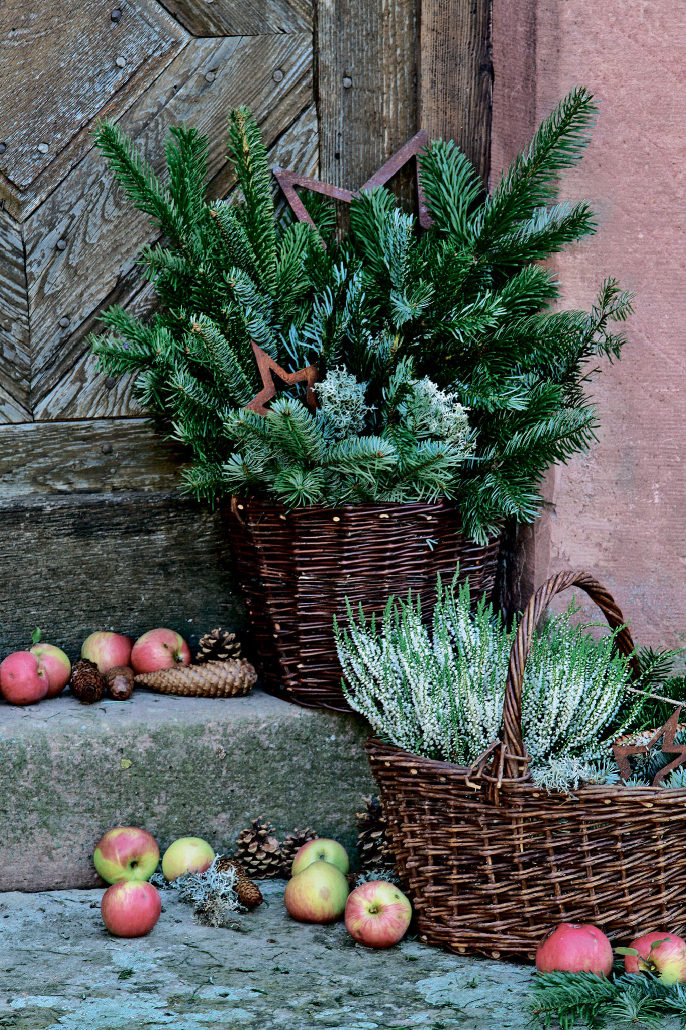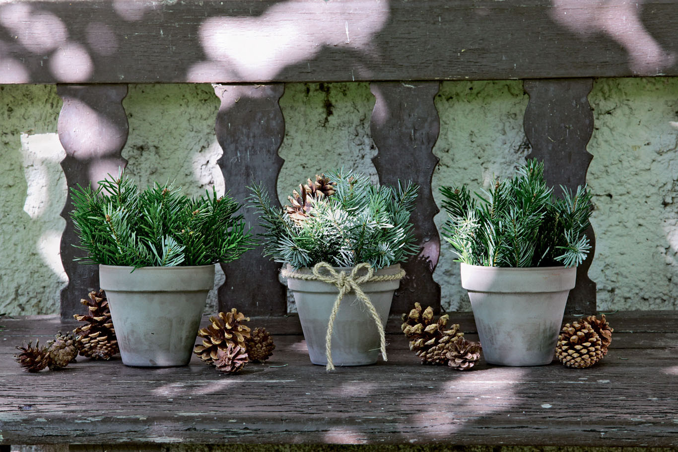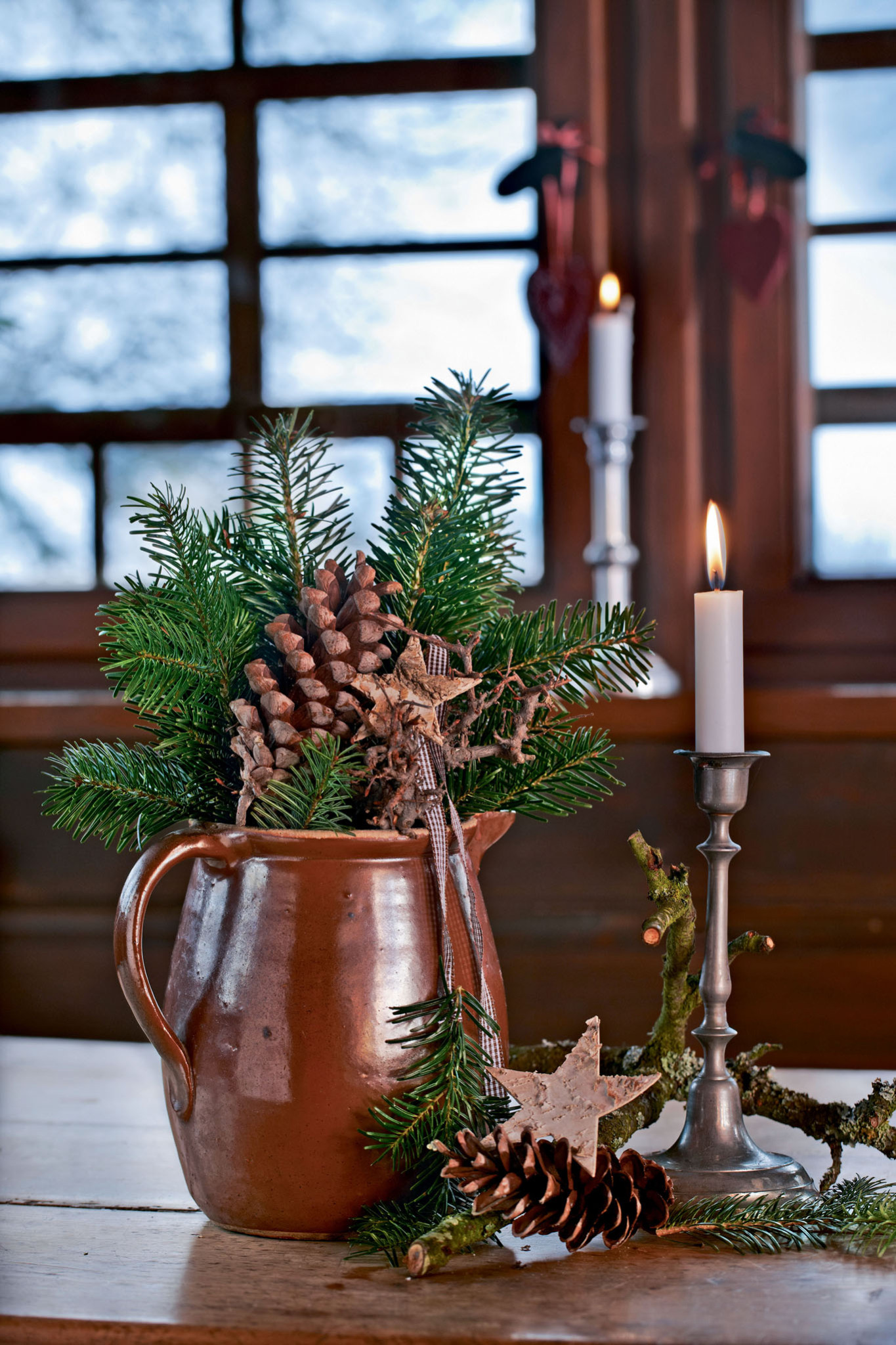 В керамических кувшинах композиции из еловых веток и шишек смотрятся особенно привлекательно. Длинная узкая лента и звездочки из бересты — дополнительный декор. За окном поставьте ящик и заполните его еловыми ветками. Украсьте их шишками, вереском, веточками других деревьев. На окне — венок: для его изготовления сделайте каркас из проволоки и закрепите на нем еловые ветки. Ступеньки лестницы украшают плетеные корзины с еловыми ветками и белым вереском. Композицию дополняют звезды с патинирующим налетом, яблоки и шишки. Очаровательное трио: небольшие цветочные горшки заполните шишками и еловыми веточками и украсьте бечевкой.