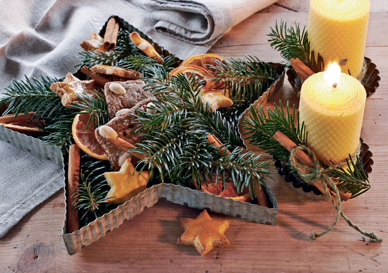 Старая форма для выпечки — идеальная емкость для композиций: разложите в ней еловые ветки, печенье, сушеные апельсиновые дольки и палочки корицы. Свечи обмотайте бечевкой, проденьте через нее ветки и палочки корицы и поставьте их в формочки для тарталеток.