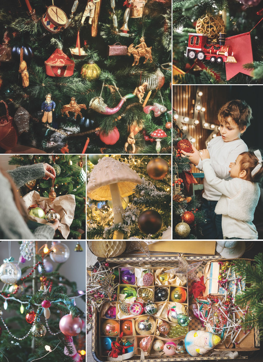 Поскольку поначалу ель украшали в основном сладостями — пряниками, конфетами, фигурным печеньем — первые картонные ёлочные игрушки тоже начали продаваться именно в кондитерских. А затем и в больших галантерейных магазинах. Это были гирлянды, китайские фонарики, стеклянные шары, фигурки из негорючей ваты. Хлопушки и «дождик» тоже родом из XIX века. Правда, увидеть эту красоту можно было только в домах горожан — крестьяне украшали еловыми ветвями только деревенские церкви, причем на всё святочное время — от Рождества до Крещения.