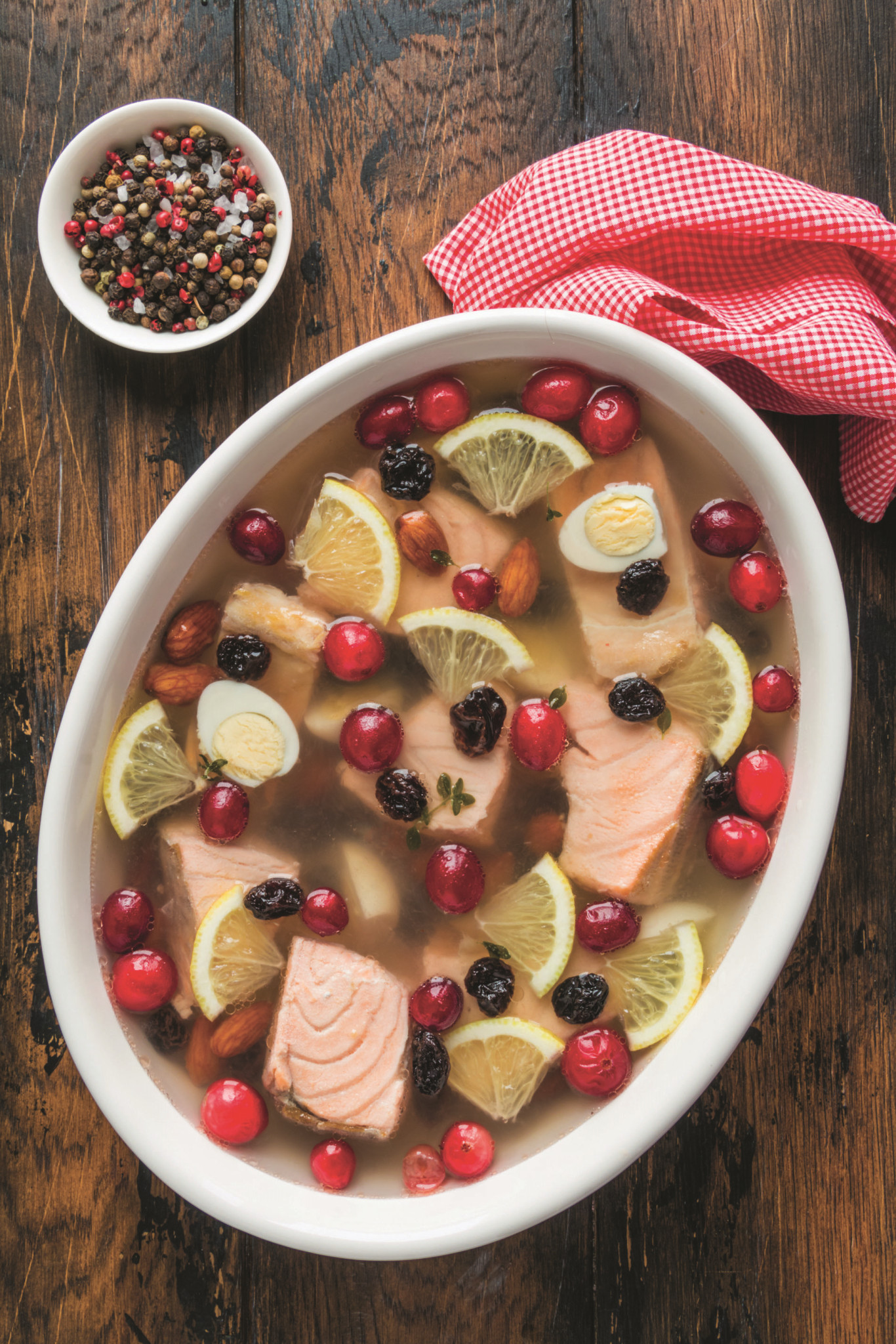 Блюдо «Заливное» в современном его понимании появилось в России лишь в конце XVIII века, хотя это название встречалось и ранее. Например, в средневековой книге «Домострой» игумен Сильвестр, перечисляя, что «в Великий мясоед после Рождества Христова к столу подают», упоминал «заливное осердье лосиное», очевидно, имея в виду более древний аналог этого блюда – студень (холодец). Собственно, именно он и лег в основу заливного Петровской эпохи, но в несколько переформатированном виде. Если студень готовился из остатков рыбы или мяса, то, по замыслу французских поваров, работавших при Петре I над модернизацией традиционных кушаний русской кухни, заливное требовало самых лучших продуктов. Нарезать их надлежало так, чтобы даже сквозь объемную толщу желе отчетливо виднелась их естественная структура, а само оно должно было быть прозрачным, как стеклышко. В стремлении добиться такого эффекта кулинары из Парижа, работавшие в Петербурге, оттачивали целый ряд непростых техник, среди которых – осветление бульонов при помощи оттяжки черной икрой (она «впитывала» из жидкости всю муть), их легкое подкрашивание лимонной цедрой, шафраном и куркумой и даже использование специального «рыбьего клея», призванного скреплять результат. «Вишенками» на этом соленом «торте», подававшемся, как правило, на большом овальном блюде или тарелке в форме рыбы, служили яркие добавки-акценты, которые делались из овощей (наиболее эффектно выглядят полумесяцы лимона и фигурно нарезанная морковь), а также предварительно просоленных грибов, фруктов и ягод.