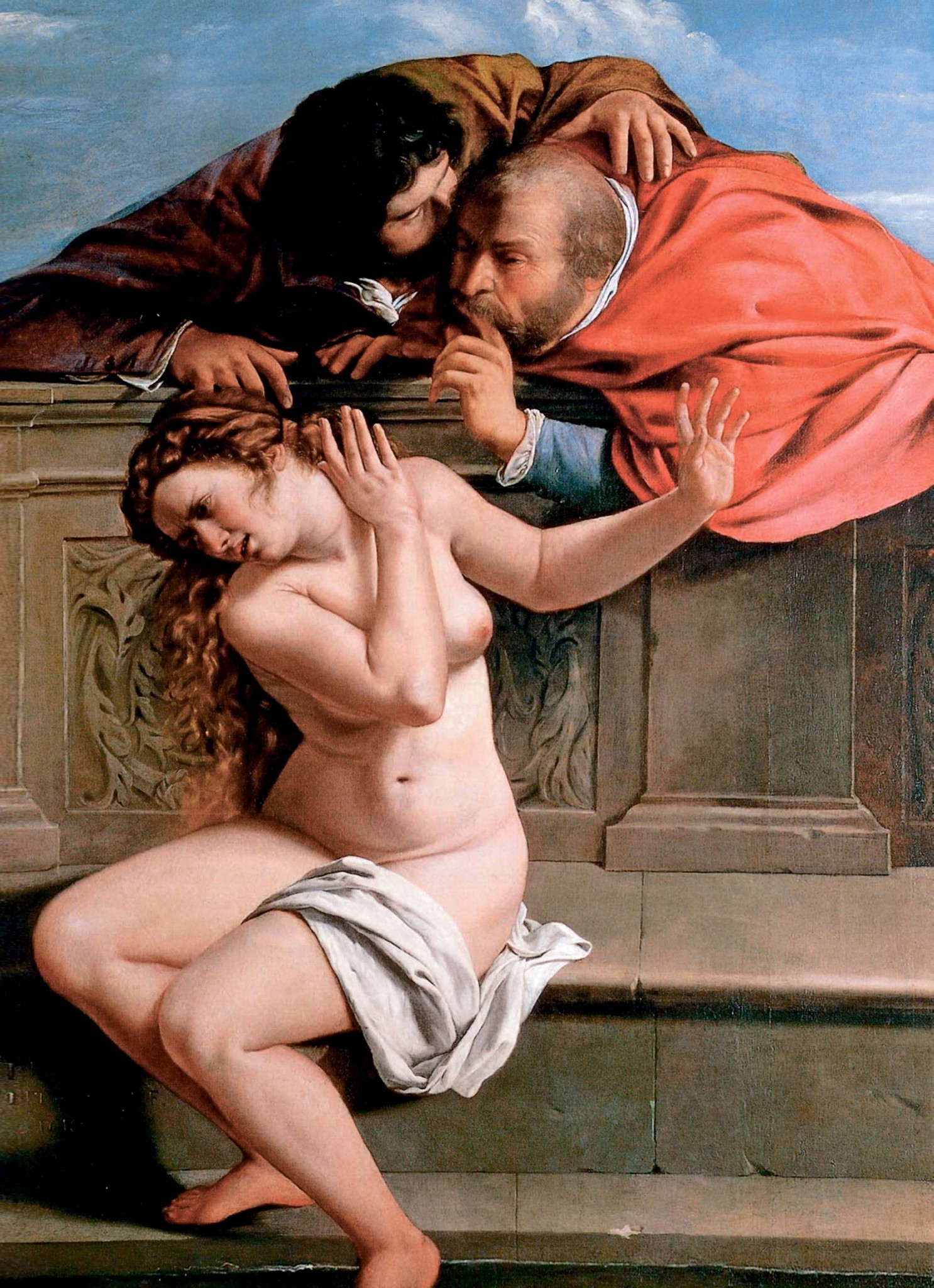 Орацио Джентилески с детьми обитал в квартале художников, где помимо богемы ошивались воры, пьяницы и проститутки. Впрочем, и среди живописцев попадались люди разные. Например Караваджо. Все знали, что Микеланджело Меризи — человек опасный, повеса, скандалист и драчун. Но признавали, что гений. Он частенько бывал в доме Орацио, проводя время за ужином и беседой, одалживал какие-то вещи в качестве реквизита для эскизов — корзину, кувшин или связку птичьих перьев, задумав изобразить крылья ангела. Караваджо первым после отца заметил искру таланта в дочери приятеля. Именно у него юная художница переняла принцип рисовать библейских и мифологических героев как обычных людей. Свою первую большую картину «Сусанна и старцы» Артемизия создала в семнадцать лет, в каком-то смысле предсказав собственное будущее. Согласно легенде, за купающейся в саду Сусанной подглядывала пара почтенных судей, которые затем пытались шантажом принудить ее к связи, угрожая ложным обвинением в прелюбодеянии. Но и под страхом смертного приговора девушка не согласилась. Спас ее от расправы пророк Даниил.