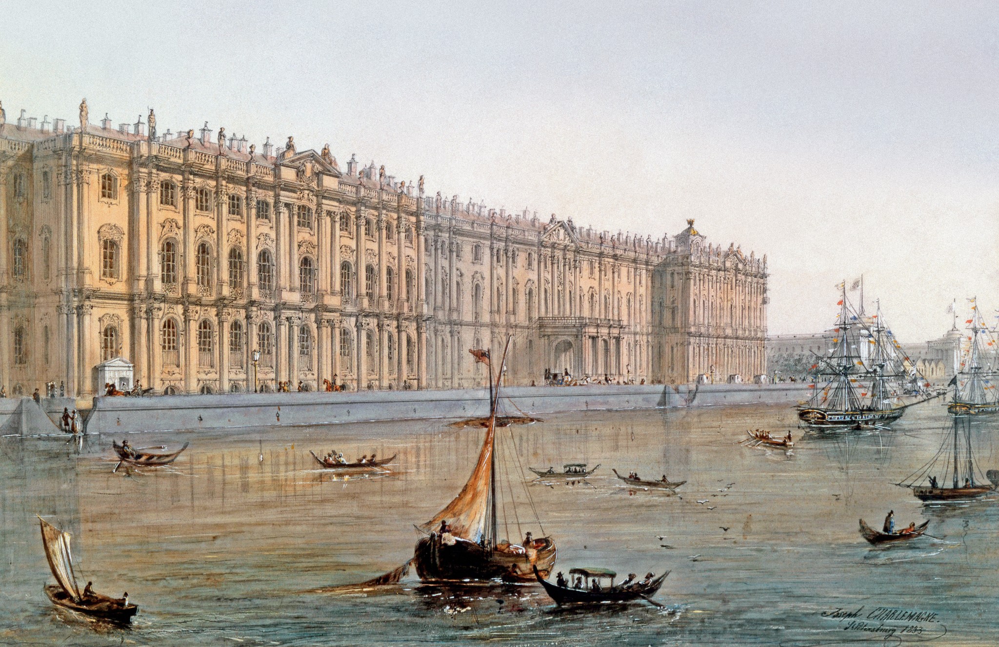 Рядом с крепостью, где Доменико Трезини начал возводить Петропавловский собор, на площади, получившей название Троицкая, складывался городской центр. От домика Петра I вверх по Неве тянулись деревянные здания Сената, Таможни, Монетного двора и трактира «Аустерия четырех фрегатов», за ними — дома вельмож, высших военных и гражданских чинов. У другого берега на фоне низкого пасмурного неба прорисовывались бесчисленные мачты — на адмиралтейских верфях строились многопушечные корабли молодого российского флота, а на расположенной рядом Галерной верфи — быстроходные лодки-галеры.