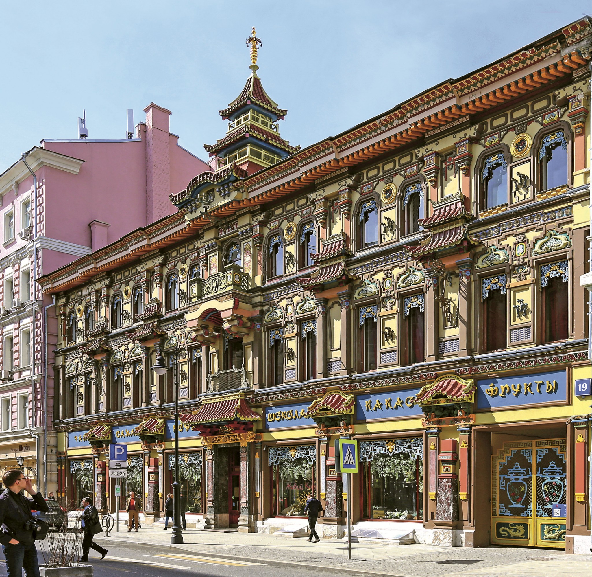 Вскоре Гиппиус приступил к работе, и через полтора года дом на Мясницкой преобразился неузнаваемо. В его облике угадывались китайские архитектурные традиции: узорчатые фризы, выносные кровли из черепицы с изогнутыми углами, колокольчики — символы съестных лавок в Китае. Разнообразные растительные орнаменты, причудливо переплетающиеся с мистическими драконами, витыми змейками, традиционными китайскими фонариками и парасолями — зонтиками от солнца, превратили дом в красочную диковинную шкатулку, привезенную из дальних странствий.