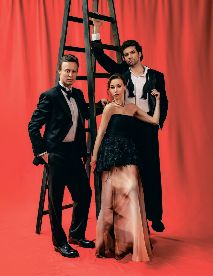 На Кристине: платье Tegin, туфли Vitacci, колье Magic Pearls. На Игоре: фрак Tegin, рубашка Karree, брюки Lime, обувь ALEKSANDER SIRADEKIAN. На Владимире: пиджак и брюки Tegin, обувь Vitacci