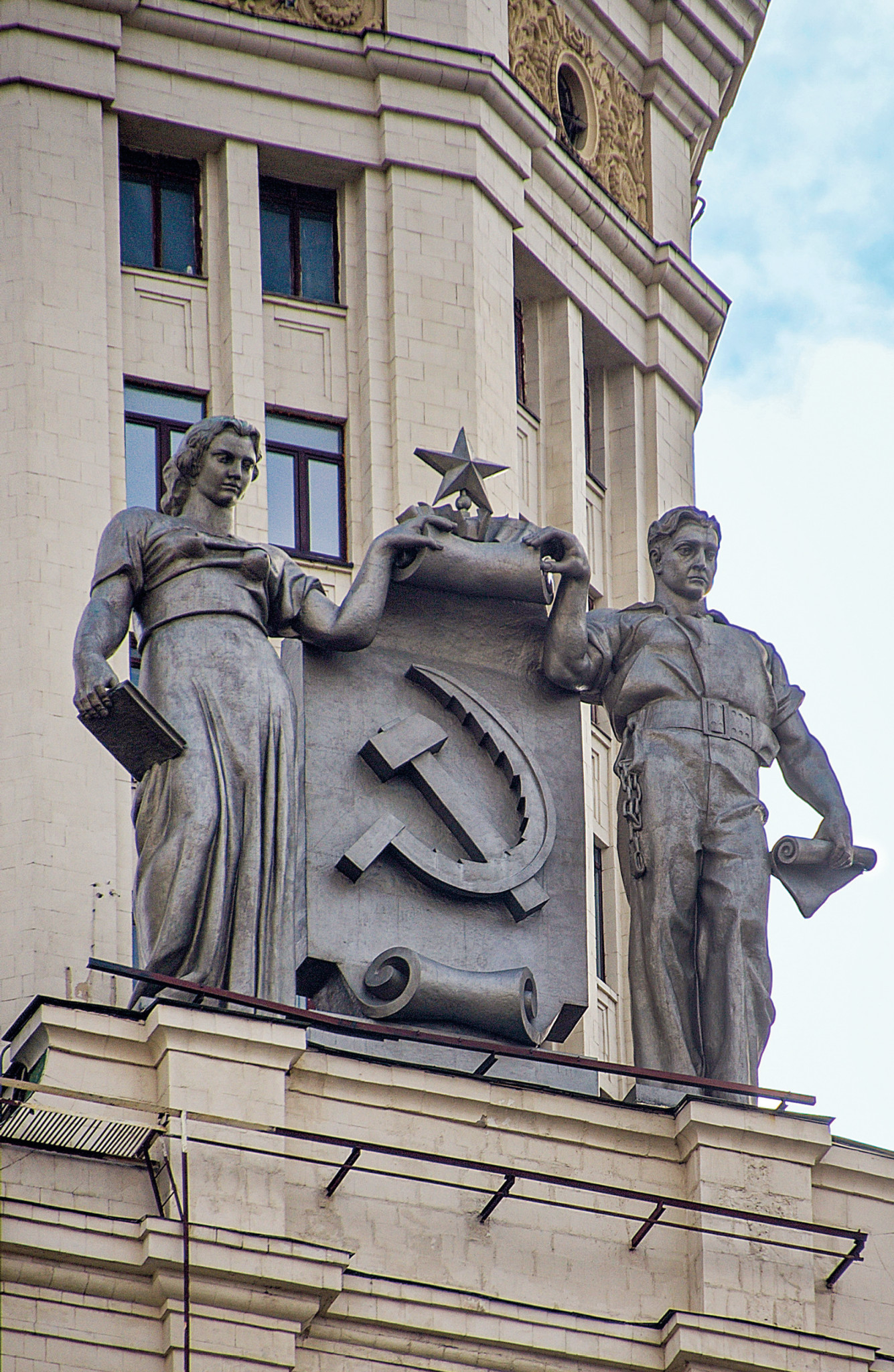 Экстерьер дома выполнен в мягком бежевом цвете, нижние этажи облицованы колотым и полированным красным гранитом, что создает иллюзию мощного высокого цоколя. На фасадах располагаются многофигурные горельефы и барельефы, изображающие счастливых советских людей среди знамен, цветов и колосьев.