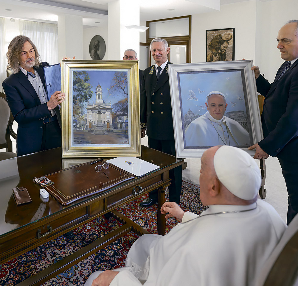 В качестве подарка я преподнес портрет Папы Римского на фоне Ватикана, окруженного летающими голубями. Но особенно важным подарком оказалась картина «Базилика Сан-Хосе-де-Флорес. Буэнос-Айрес» — изображение храма, где глава Римско-католической церкви начинал свой основной духовный путь. Особенно тепло было принято им то, что картина провела более полугода на станции МКС, которая за это время сделала 3000 витков вокруг земного шара. Полотно даже побывало в открытом космосе. Брал на борт его самый известный современный космонавт нашей страны, герой России Олег Артемьев.