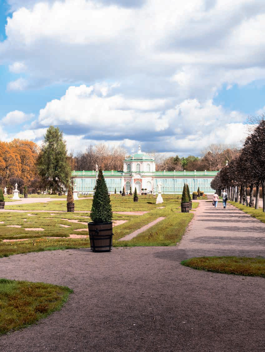 На территории комплекса расположен Дворец — главное сооружение в усадьбе, храм, павильон «Грот», Голландский, Итальянский и Швейцарский домики, «Эрмитаж», Большая каменная оранжерея, Кухонный флигель и Американская оранжерея.