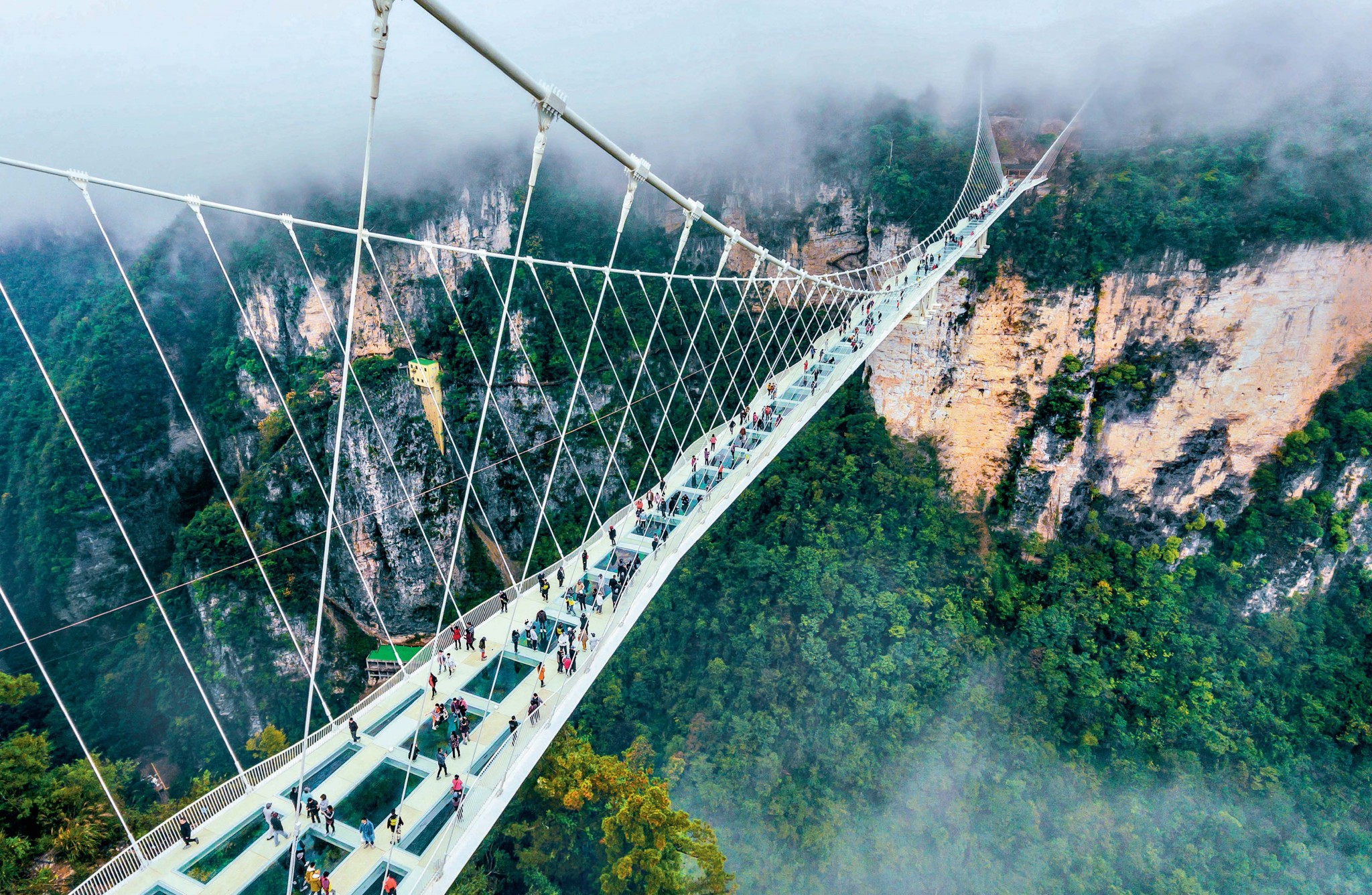 Неземной пейзаж привлекает огромное число туристов со всего света, и власти Китая этим умело пользуются. Первая стеклянная тропа открылась в здешних горах в ноябре 2011 года. Она висит над пропастью глубиной 1400 метров, примыкая с одной стороны к горе Тяньмэнь. Тропа недлинная — всего 60 метров — и является частью маршрута, опоясывающего гору. До этого туристы любовались окружающими пейзажами с традиционных деревянных мостков, которые испокон веков строили крестьяне и монахи в труднодоступных местах. Говорят, однажды смотритель заповедника заметил, что посетители скапливаются у прорехи в поврежденном дощатом настиле и с замиранием сердца вглядываются в бездну под ногами. Он рассказал о своих наблюдениях начальству, предложив закрыть дыру стеклом. Руководство парка оценило идею и даже пошло дальше — так появилась первая прозрачная дорога.