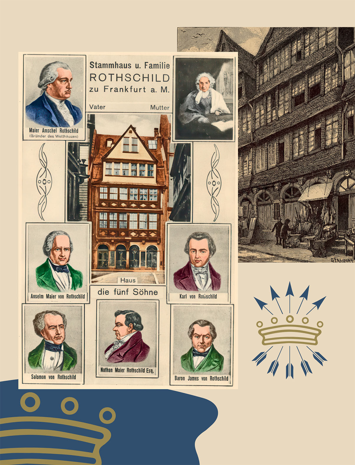 Еврейский квартал во Франкфурте первой половины XVIII века был нагромождением грязных лачуг и покосившихся полуразрушенных строений, тесно прижавшихся друг к другу. Смрад висел над кривыми переулками, наполненными криками обитателей. Среди этих развалин был и дом с красной вывеской, от которой и произошла фамилия «Ротшильд».