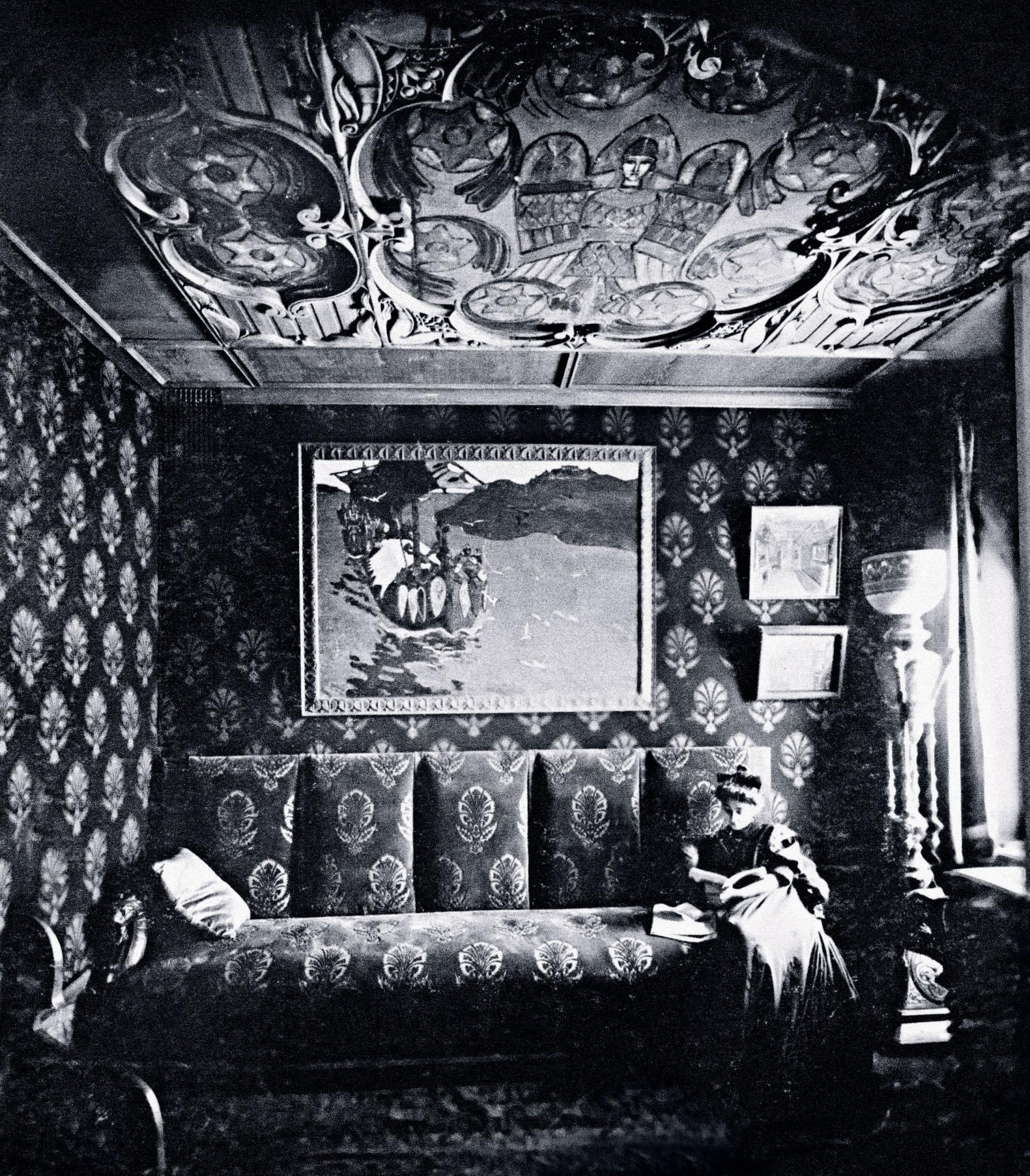 В кабинете главы семьи особенно впечатляли хоры с библиотечными стеллажами, большой камин и широкая оконная ниша с витражом, сделанным по эскизу Михаила Врубеля. Из общего контекста выбивалась лишь курительная комната. Ее, как и положено, оформили в восточном стиле, богато украсив арабской и бухарской бронзой.