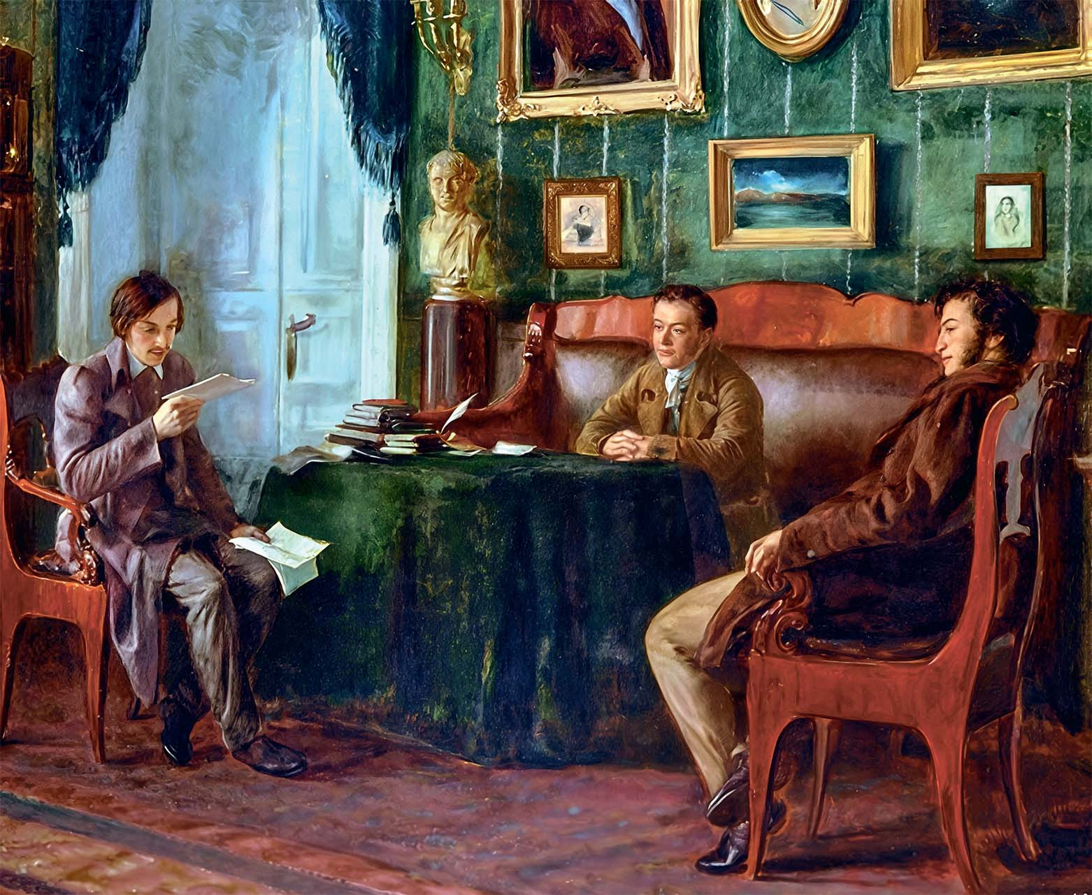 «Гоголь среди своих великих друзей» (из летнего пребывания Гоголя в Царском Селе у Жуковского в 1831 году), художник П.И. Геллер, 1904 год. Репродукция. Фото: Rustock/Vostock Photo