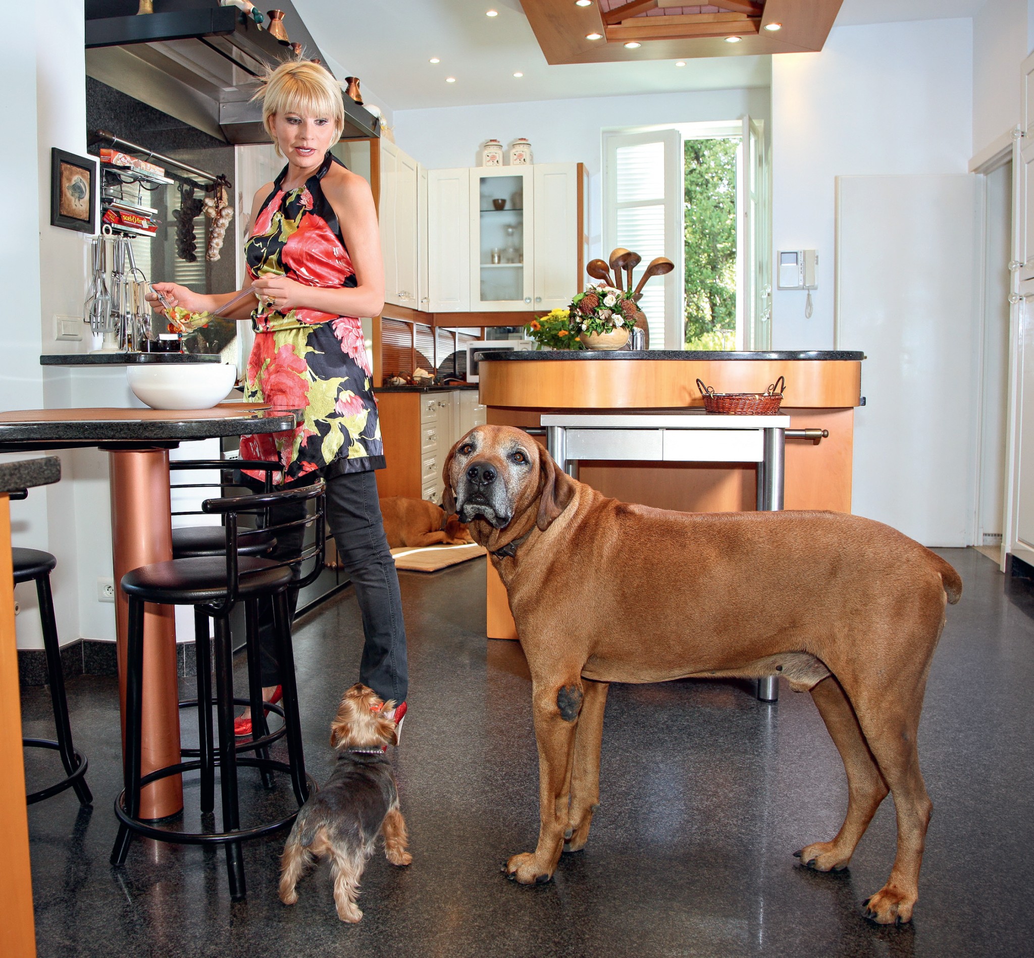 Чуть позже Юра завел двух родезийских риджбеков. Имена были длинные и сложные, мы называли их Аскир и Бижу. Вид они имели довольно свирепый, но существами были добрейшими и очень умными. Аскиру страшно нравилась Гера — прямо слюни пускал, когда ее видел. Она же его игнорировала. Но однажды Гера влюбилась! Меня пригласили в жюри программы Михаила Ширвиндта дог-шоу «Я и моя собака». И я, конечно же, взяла нашу малышку с собой. Одной из участников программы была овчарка, парень по кличке Зорро. И что вы думаете? Гера, которая других собак всю жизнь хватала за нос, увидев его, подняла переднюю лапу и стала ею махать, будто приветствуя... А потом принялась вздыхать и попискивать. В перерыве мы подошли к этому Зорро, Гера вся прямо извелась — а он на нее ноль внимания!