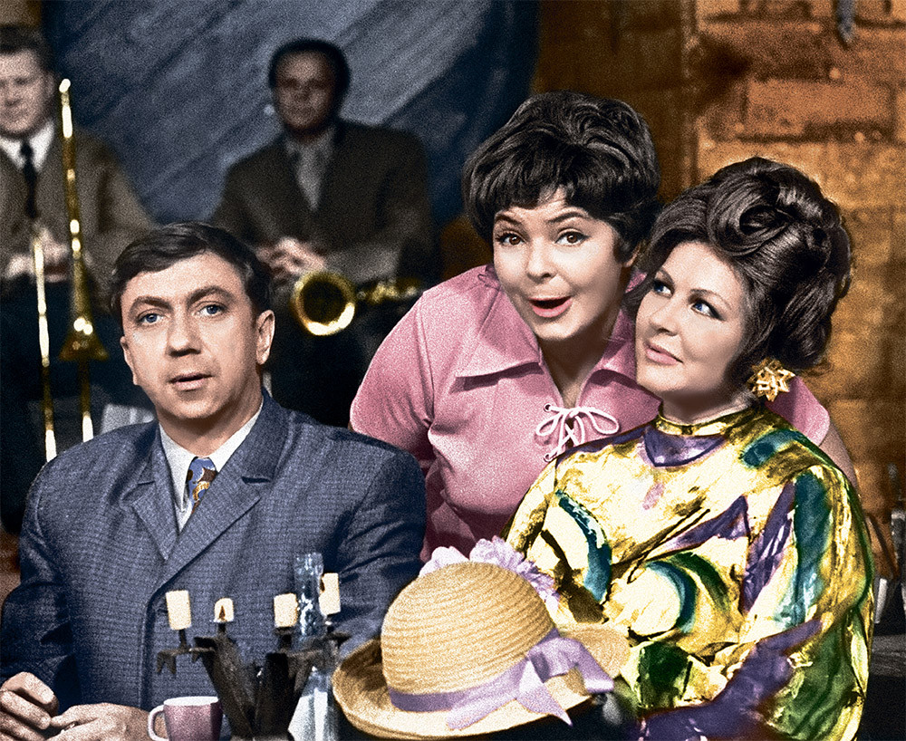В этой роли я сразу представила Олю Аросеву и поняла, что на основе этих сюжетов можно сделать телевизионную постановку. Но на мужа моя идея впечатления не произвела. Тогда в союзники я решила взять саму Ольгу Аросеву и дала прочитать ей монолог про сумку. Как я и ожидала, она за него ухватилась со страшной силой. К этому моменту в театре она была практически без ролей, у нее случился конфликт с Плучеком (об этом расскажу ниже). Теперь мы вместе с Аросевой стали наседать на Георгия Васильевича. Сколько же сил ушло на то, чтобы убедить Зелинского взяться за эту работу! Он был невозможно упертый человек, мы поэтому со временем и расстались. В то время мы жили вместе с родителями на Соколе. Но у нас была машина «Победа». И, чтобы не мешать родителям, уходили спорить до полуночи в машину. Программу, которую мы задумали, назвали «Добрый вечер». Здесь было два основных персонажа: женщина с сумкой — Аросева и моя героиня — Певица. Дело в том, что в ГИТИСе я училась на музыкальном отделении у самой Марии Максаковой, и поэтому у меня был хороший профессиональный голос. Пригласили мы и Спартака Мишулина. Он обожал Чаплина и очень увлекался пантомимой. И Георгий Васильевич специально для него придумал соответствующие номера. Съемки поначалу проходили не на Шаболовке, а в бывшем помещении Театра Моссовета на площади Журавлева (сегодня это «Дворец на Яузе». — Прим. ред.). Программа «Добрый вечер» не задумывалась как многосерийная история. Но я настаивала на том, что может получиться замечательный сериал. Почему-то я употребляла именно это малознакомое слово. Как оно пришло мне на ум? Не знаю. На советском телевидении тогда никаких сериалов не было. Просто в тексте было так много миниатюр, что стало ясно: эту историю можно растянуть надолго. Особенно если еще чем-то дополнить. Помог невероятный случай. Я ходила на маникюр в гостиницу «Метрополь» и там приметила в киоске под вывеской «Юмор наших друзей» сатирические журналы, которые продавались для иностранцев. И, листая эти журналы, увидела, что в них множество историй, которые можно перенести на экран. Тогда я пробежала по остальным элитным гостиницам и скупила все переводные юмористические журналы на русском языке: румынские, югославские, гэдээровские, венгерские. В них была масса анекдотов, миниатюр, комиксов, фельетонов, сцен. Всех персонажей и их имена, которые есть в «Кабачке», я нашла в этих журналах: официантов, директора гостиницы, музыканта, таксиста и прочих. А специалисты в редакции литдрамы уже адаптировали эти сюжеты и сплели их в полноценный сценарий. Актеров подбирали мы с Георгием Васильевичем вместе. Неудивительно, что в «Кабачке» собрались в основном артисты Театра сатиры, хотя были и «со стороны». Директива свыше была такая: «Ни одной противной физиономии на экране!»