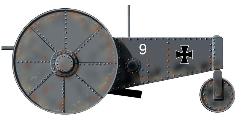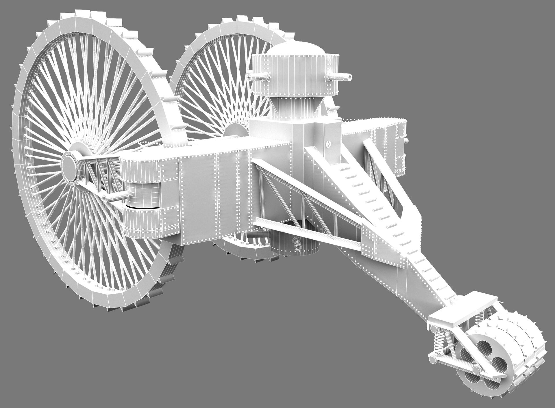 Первый серьезный проект гигантского колесного танка предложил в начале Первой мировой войны капитан британской Королевской военно-морской авиационной службы Томас Хеттерингтон. Его машина должна была иметь броню 80 мм и передвигаться на трех колесах: спереди пара ведущих диаметром по 12 м (!) каждое и одно рулевое сзади. На бронеплатформе предполагалось разместить три башни, в каждой из них планировалось установить по два 102-мм орудия.