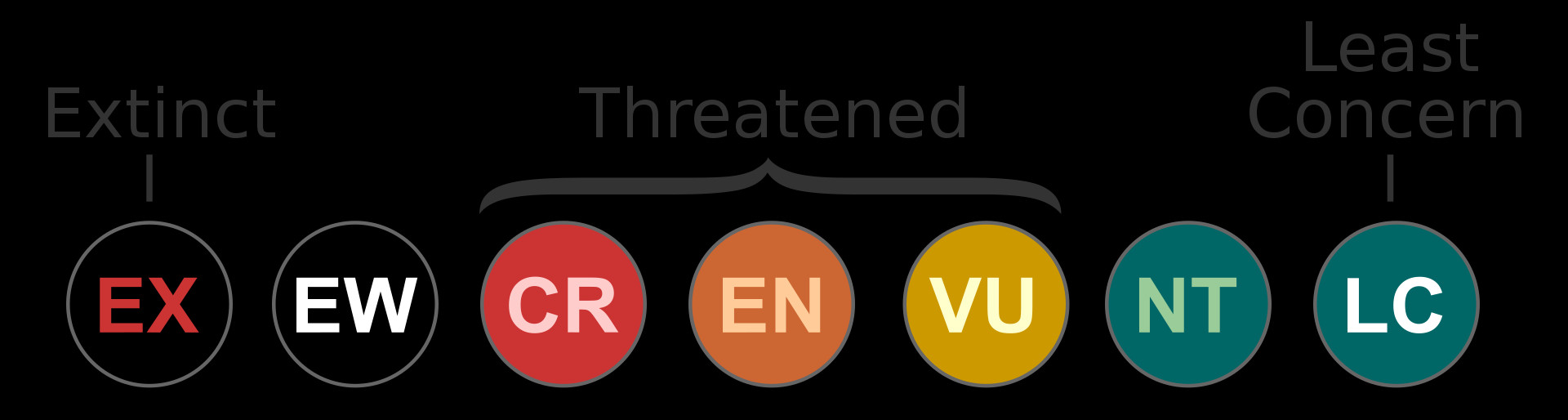 Международный союз охраны природы (International Union for Conservation of Nature and Natural Resources, IUCN) начиная с 1960 годов ведет список, который содержит информацию о положении десятков тысяч представителей флоры и фауны. Каждому виду в нем присвоен один из семи статусов, в зависимости от того, насколько велика угроза его существованию: от вызывающих наименьшие опасения (Least Concern) до вымерших (Extinct). Виды со статусами уязвимых (Vulnerable), вымирающих (Endangered) и находящихся на грани полного исчезновения (Critically Endangered) иногда коллективно называют угрожаемыми или находящимися под угрозой вымирания (исчезновения). В дополнительную категорию выделены виды, для оценки положения которых недостаточно данных (Data Deficient).