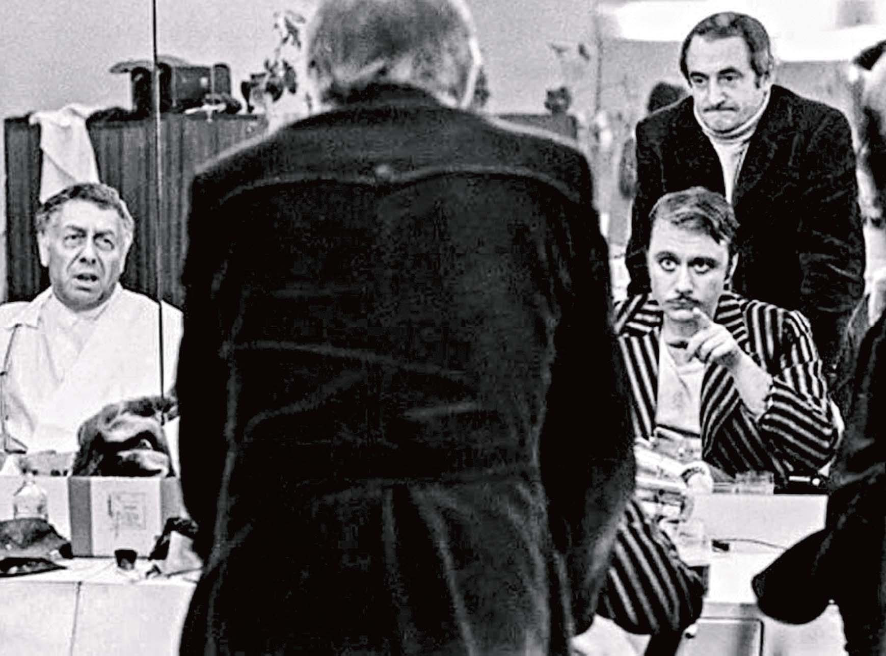 «Телевизионное кино было раньше не таким уж модным, но то, как играют в паре Папанов и Миронов в «12 стульях» в постановке отца, это, конечно, грандиозно». Анатолий Папанов, Андрей Миронов и Марк Захаров на съемках телевизионного фильма «12 стульев», 1976 год. Фото: из архива А. Захаровой