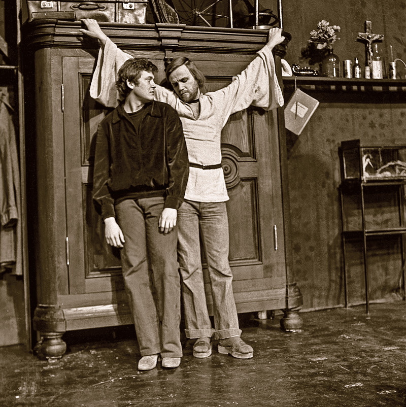 С актером Евгением Соляковым в спектакле «Телевизионные помехи». В этой постановке состоялся дебют Юрия Стоянова на сцене Большого драматического театра, 1978 год. Фото: Борис Стукалов/Предоставлено Творческо-исследовательской частью БДТ им. Г. А. Товстоногова