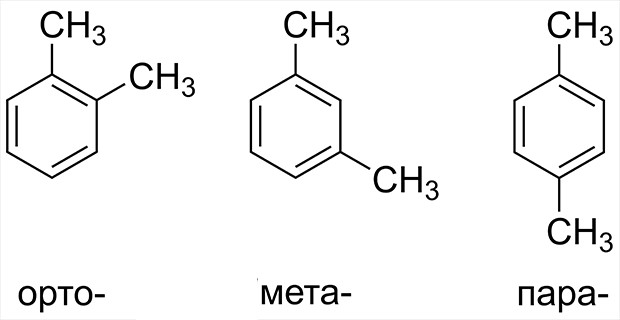 Молекулы ксилолов (диметилбензолов) построены из шестичленного углеродного кольца, к которому присоединены две метильные группы. Причем метильные группы могут располагаться относительно друг друга тремя способами: в случае орто-изомера они находятся на соседних атомах углерода, в случае пара-изомера — на противоположных, а в случае мета-изомера — через один углерод. Так, существуют три изомерных диметилбензола с разным расположением метильных групп.