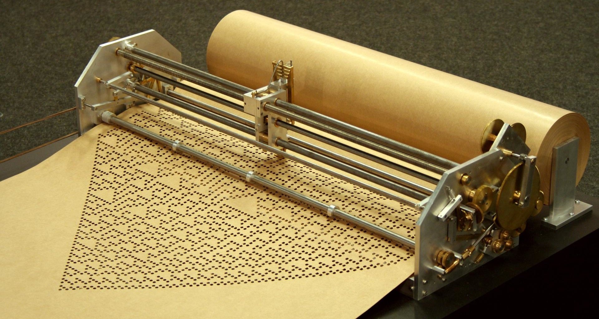 На фото сверху – Rule 30 («Правило 30», 2008) – дырокол, рисующий на бумаге эволюцию во времени так называемого «правила 30», одного из одномерных двоичных правил для клеточных автоматов. Правило введено в 1983 году британским математиком Стивеном Вольфрамом; для подробного объяснения проблемы впору писать отдельную статью. Предельно упрощая, можно сказать, что правило является генератором псевдослучайных последовательностей.
