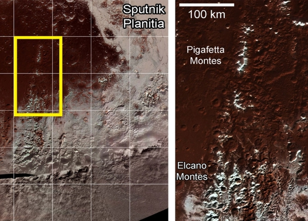В 2015 году космический аппарат New Horizons обнаружил неподалеку от равнины Спутника на Плутоне горы Пигафетта. Их пики возвышаются на 2,5-3,5 километра над подножием (или на четыре километра над средним радиусом карликовой планеты). Вершины этих гор напоминают земные, с той лишь разницей, что лед там метановый. При этом оставалось непонятным, как образовались эти ледники — атмосфера Плутона примерно в сто тысяч раз более разреженная, чем земная, и она почти не может ни нагреть, ни охладить поверхность. Получается, температура Плутона на всех высотах одинакова, и нет явного механизма, который бы покрывал снегом именно вершины гор.