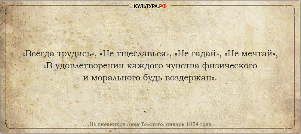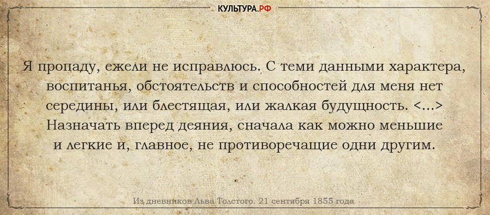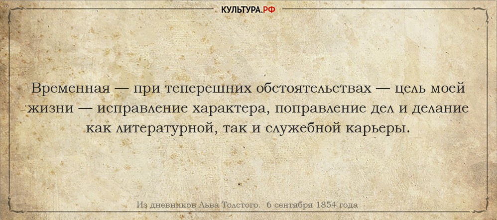 6 сентября 1854 года. Важнее всего для меня в жизни исправление от лени, раздражительности и бесхарактерности. Любовь ко всем и презрение к себе!