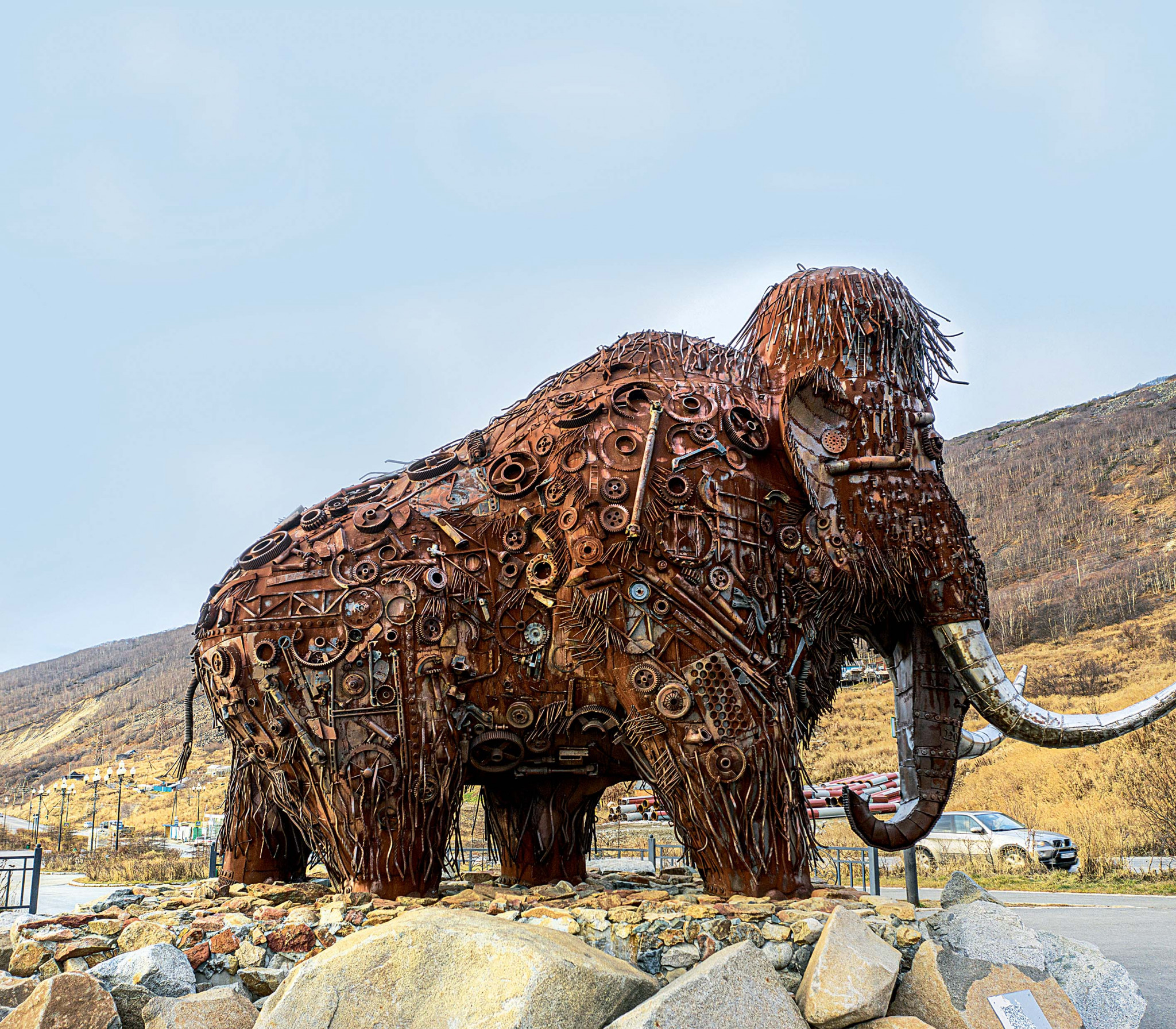 Гигантский мамонт из металлолома возвышается у магаданской бухты Нагаева. Официально он не просто мамонт, а скульптура «Время». «Шкура» мамонта покрыта шестеренками, винтиками и подшипниками и напоминает элементы часового механизма.