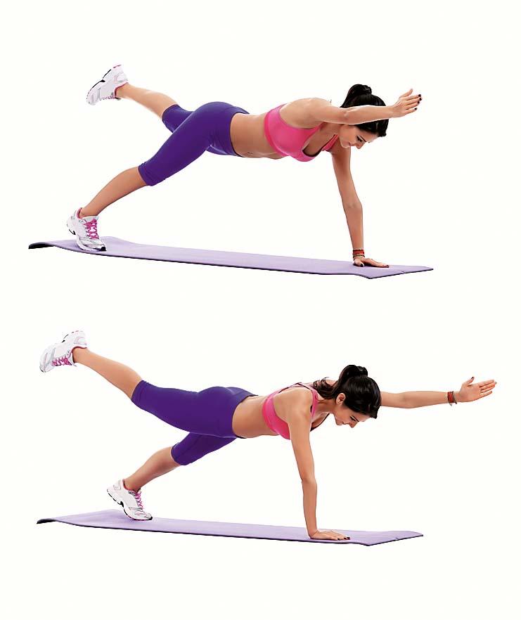 Традиционное упражнение усложняется подъемами противоположной руки и ноги. Прими упор лежа (опираясь ладонями или предплечьями об пол). Затем одновременно подними правую руку и левую ногу. Задержись в этом положении на 30 секунд, поменяй руку и ногу. С тренировкой старайся жать планку чуть дольше. Сделай еще 2 подхода.