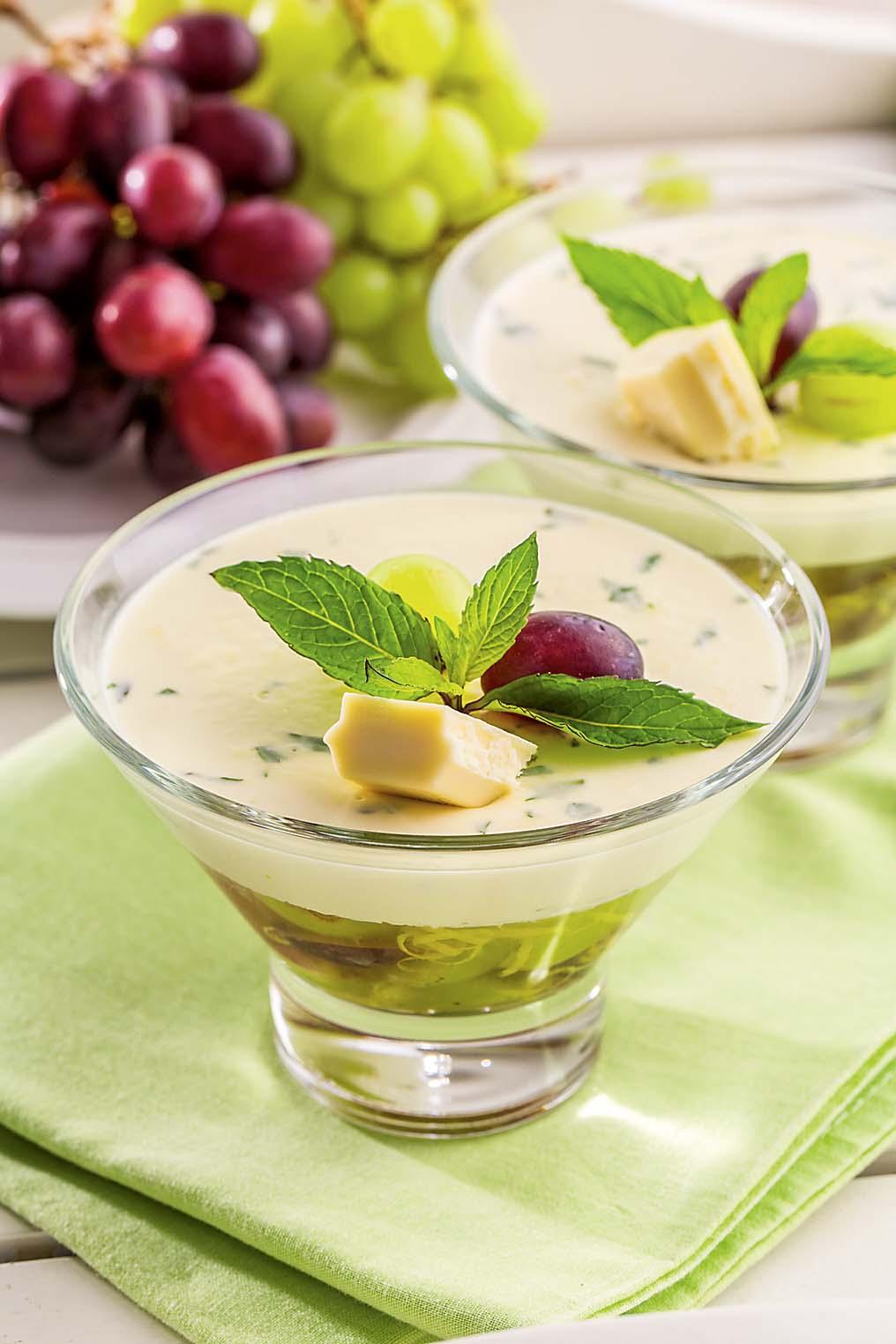 На 4 порции: • 1 ст. л. желатина • сок 1 лимона • 100 г винограда • 15 листочков мяты • 250 мл жирных сливок • 70 г тертого белого шоколада