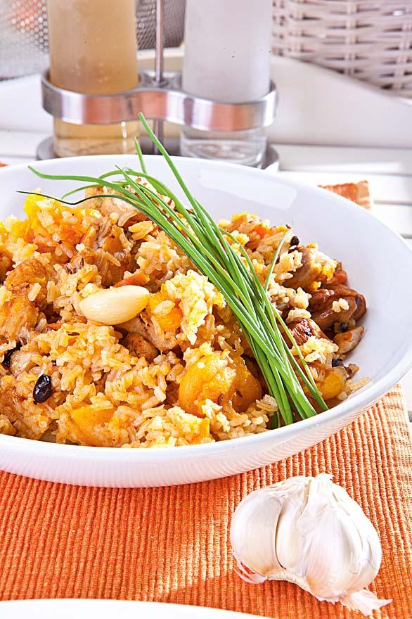 На 4 порции: • 1 кг куриной мякоти • 4 луковицы • 4 моркови • 100 мл растительного масла • по 1 ст. л. сушеного барбариса и зиры • 1/2 ч. л. молотого перца • 100 г кураги • 400 г длиннозерного риса • 1 головка чеснока • соль
