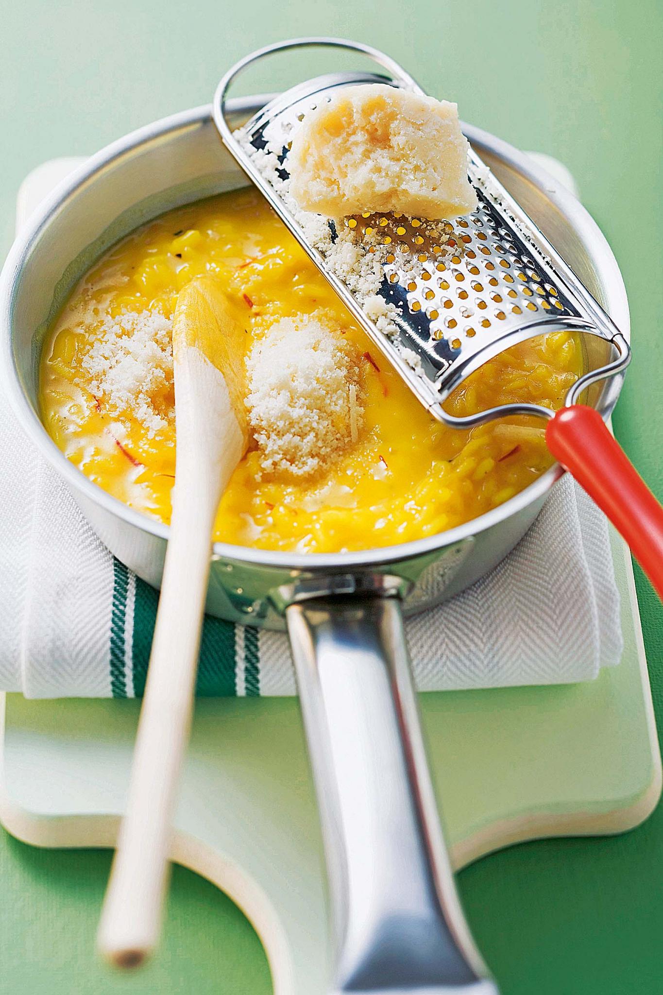 На 4 порции: • 1 луковица • 100 г сливочного масла • 400 г среднезерного риса • 200 мл белого сухого вина • 1 л горячего куриного или овощного бульона • 50 г тертого сыра • щепотка шафрана • соль • молотый черный перец