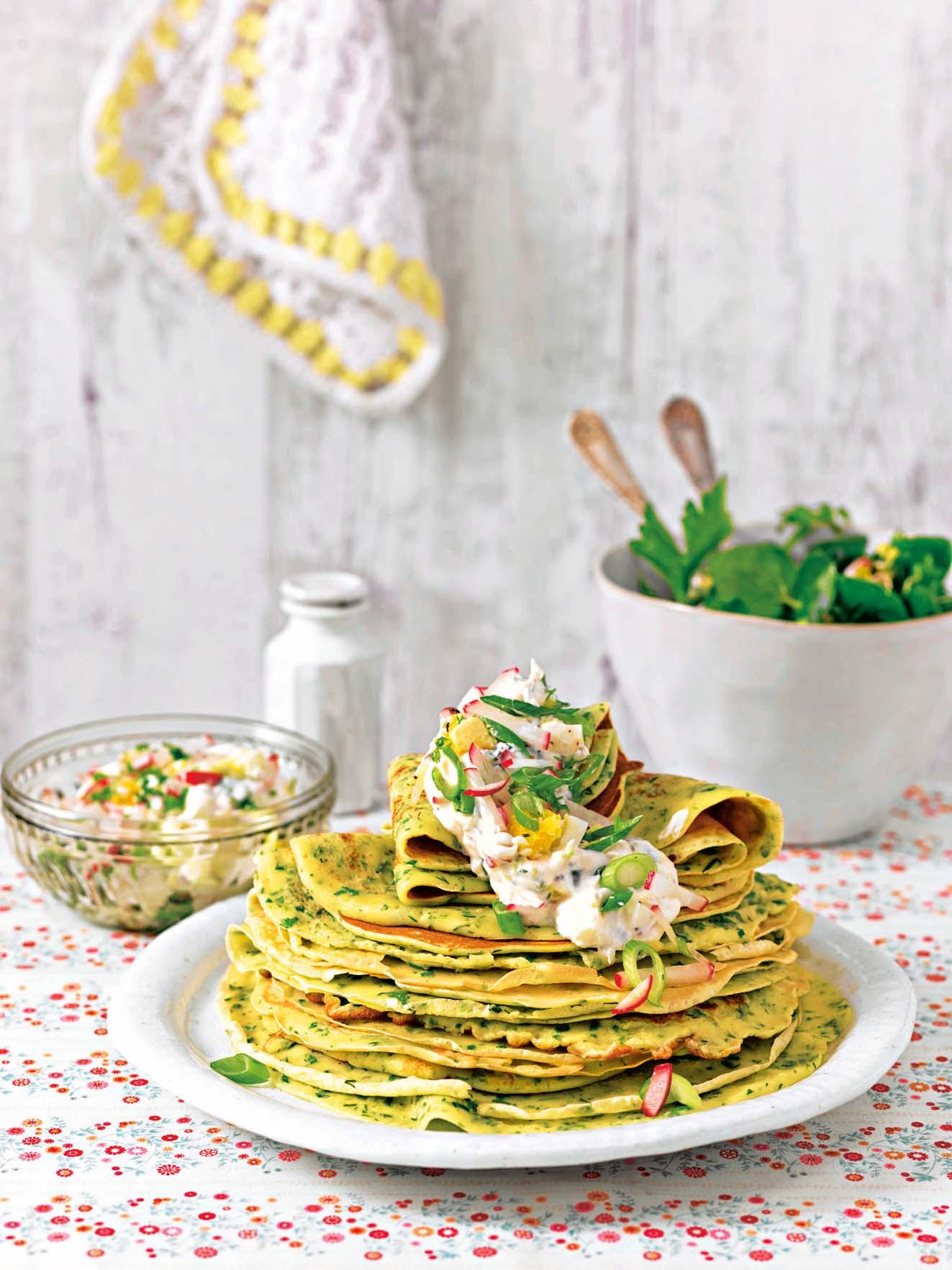 свари вкрутую 2 яйца, мелко нарежь. Затем нарежь редис и зеленый лук. Смешай творог с 3 ст. л. молока, сметаной и горчицей. Добавь соль, перец и измельченный чеснок, соедини с луком и яйцами. Вкусный творожный соус готов. Оставшиеся яйца, молоко и муку смешай, чуть подсоли, добавь растительное масло, немного воды и взбей. Измельчи кресс-салат и петрушку и добавь в тесто. Испеки тонкие блинчики. Подавай с творожным соусом.