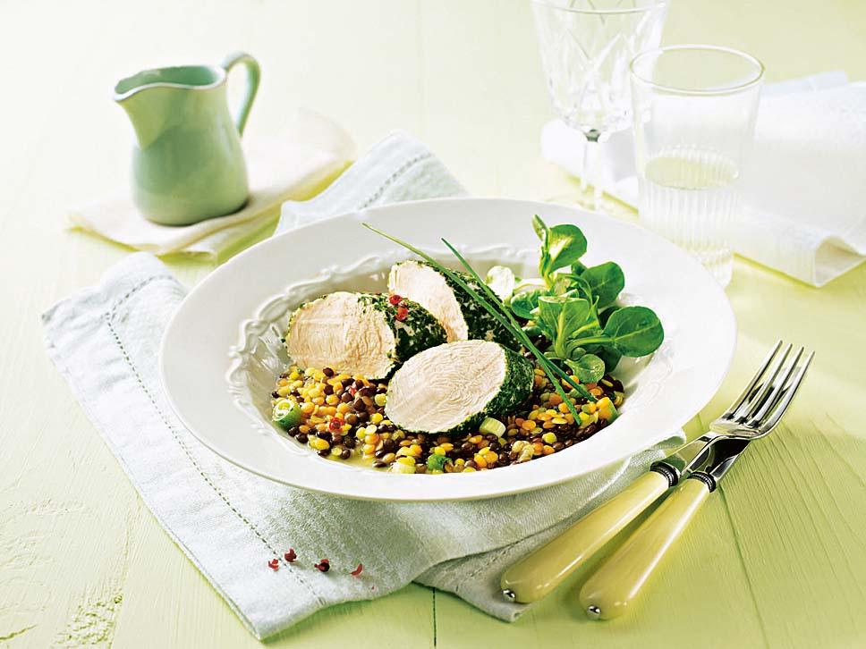 • 500 г филе индейки (грудка) • 2 ч. л. измельченного свежего или сушеного шалфея • 2 ч. л. мелко нарезанного тимьяна • 2 ч. л. свежего розмарина • соль, перец по вкусу • растительное масло • 100 г красной и желтой чечевицы