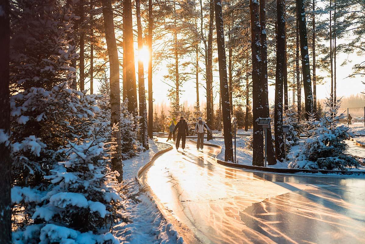 Один из самых живописных катков города залит прямо посреди леса на горнолыжном курорте «Охта-Парк» (ок. 10 км от Петербурга). Ледовая трасса петляет словно тропинки среди высоких деревьев. Настоящая зимняя сказка!