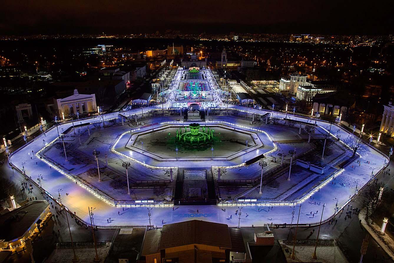 Самый большой в мире каток с искусственным льдом. Вот такое официальное звание у ледовой площадки на ВДНХ. Одновременно здесь могут находиться до 4500 человек, и никому не будет тесно. Да и поглядеть здесь есть на что. Каток в этом году превратился в кусочек Арктики – с впечатляющими инсталляциями на тему «Волшебный лес», фигурками полярных животных и пешеходным мостом «Северное сияние», перекинутым через лед. Есть здесь и фудкорт, и пункт проката, и романтичная аллея влюбленных. А по выходным можно принять участие в утренней зарядке на коньках.