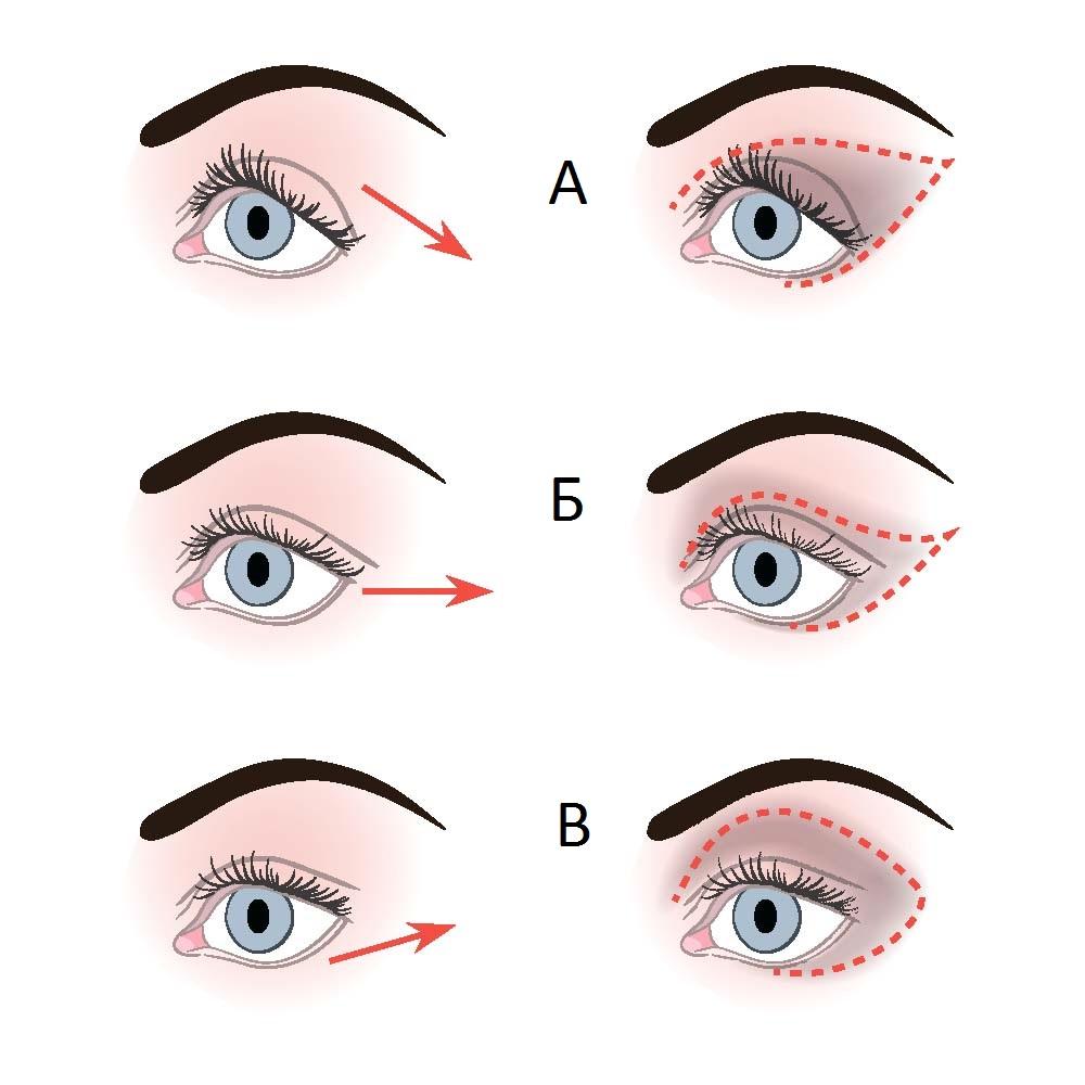При нависших веках (А) нанеси до бровей светлые тени, а темными подведи линию роста ресниц и сделай растушевку. При близко посаженных глазах (Б) нанеси во внутренний уголок светлые тени и растушуй их темными, делая также небольшую подводку на нижнем веке. Маленькие глаза (В) станут больше, если на все веко нанесешь светлые тени, а на складку чуть более темные.