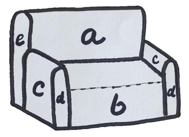 Ориентируясь на рисунок, измерь все стороны своего дивана. Рассчитай, сколько потребуется ткани. Купи ткань и вырежи по одной детали a и b и по 2 детали c, d, e.