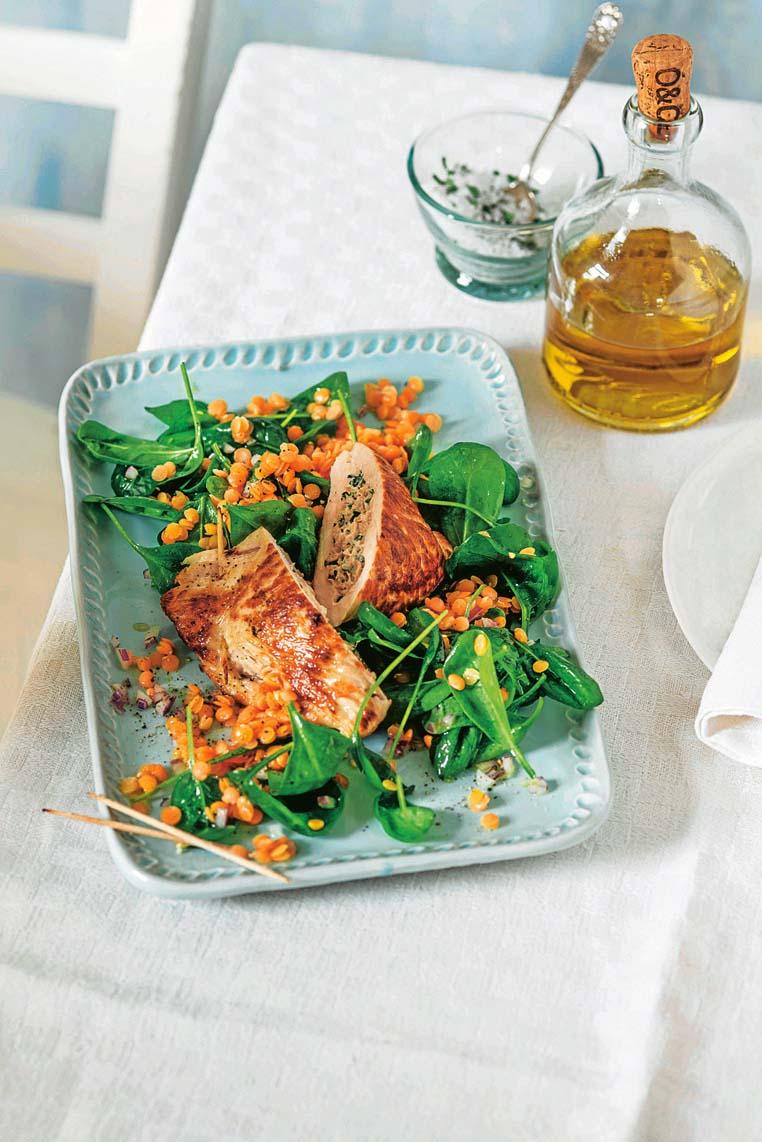 Приготовление: отвари чечевицу. Шпинат, лук и помидор нарежь и спассеруй. Смешай с чечевицей и добавь чеснок. Филе надрежь, формируя «кармашек». Посоли и поперчи. Начини чечевицей с овощами, скрепи зубочистками и обжарь. Выложи рулеты в форму для запекания, залей 1/2 стакана томатного соуса и запекай 15 мин.