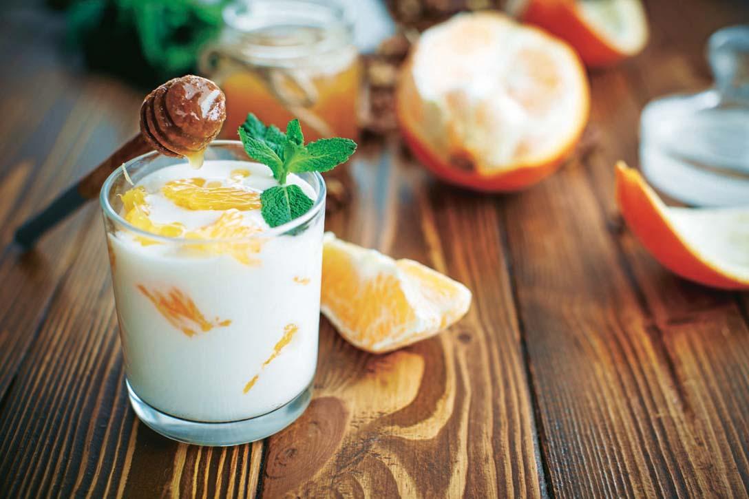Приготовление: смешай греческий йогурт с медом. Выложи сверху очищенные дольки апельсина и укрась мятой.