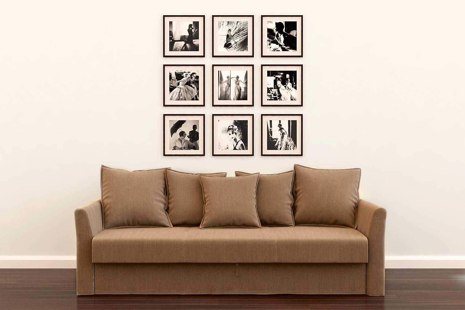 Вариант для тех, кто не хочет рисковать. Понадобится выбрать главную, самую большую рамку и дополнить ее идентичными, вписав в прямоугольник в пределах высоты главной рамки. Такая композиция хорошо подойдет для лаконичного интерьера в современном стиле и будет удачно смотреться над диваном со строгими линиями.