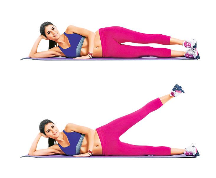 Ляг на правый бок, подопри рукой голову. На вдохе медленно подними левую ногу под углом 70° и на выдохе опусти. Каждой ногой сделай по 15–20 махов.