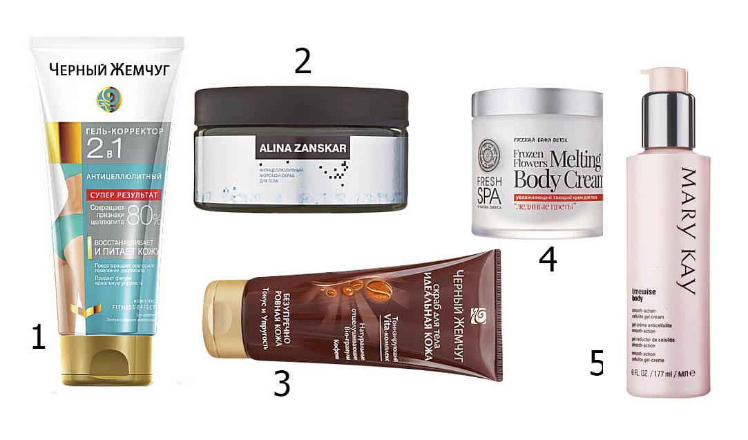 1. Антицеллюлитный гель-корректор 2 в 1 «Черный Жемчуг». Цена 220 руб.* 2. Антицеллюлитный морской скраб для тела Alina Zanskar. Цена по запросу. 3. Скраб для тела «Идеальная кожа» «Черный Жемчуг». Цена ок. 216 руб.* 4. Увлажняющий тающий крем для тела «Ледяные цветы» Fresh SPA Natura Siberica. Цена 1700 руб.* 5. Крем-гель Smooth-Action TimeWise Body против признаков целлюлита Mary Kay. Цена ок. 2020 руб.*