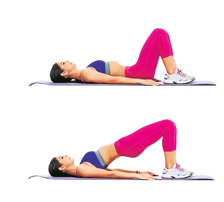 Ляг, руки вытяни вдоль туловища. Ноги согни в коленях, разведи чуть в стороны. Оторви область таза от пола, а плечи, лопатки и стопы оставь прижатыми. Медленно опустись.