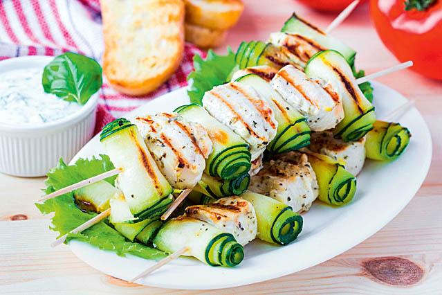 Приготовление: филе нарежь ломтиками. Отбей, подсоли, добавь измельченные чеснок и петрушку, 1 ст. л. соевого соуса и растительного масла. Дай промариноваться 10 мин. Цукини нарежь полосками. Уложи на противень, подсоли. Поставь в духовку на 10 мин. На полоски цукини уложи курицу и посыпь тертым сыром, заверни в виде рулетиков. Наколи на шпажку и запекай 20 мин.