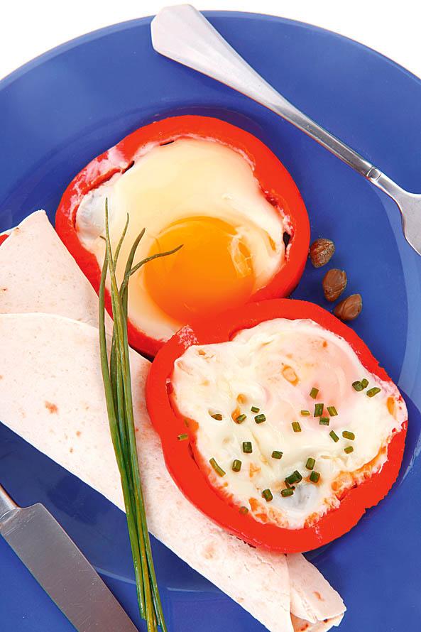 Приготовление: вымой перец и удали у него сердцевину. Острым ножом нарежь перец поперек, чтобы получились кольца толщиной около 1 см. На смазанной маслом сковороде слегка поджарь перец с одной стороны, затем переверни кольца. В каждое кольцо вылей по одному яйцу. Подсоли, добавь лук.