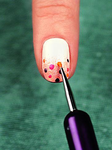 Шаг 3. С помощью специального аппликатора с круглым концом (профессионалы называют его «дотс») или тонкой кисточки поставь на «линии улыбки» фиолетовые, розовые и оранжевые горошины.