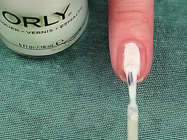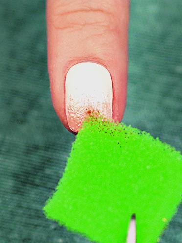 Шаг 2. Покрой ногти базой и белым лаком в два слоя. Сухой поролоновой губкой нанеси на край ногтя оранжевый лак («линию улыбки») . Покрытие должно смотреться как будто слегка размытым.