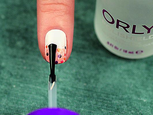 Шаг 4. Когда горошины высохнут, нанеси на лак верхнее защитное покрытие. Теперь подпитай зону кутикулы: капни немного питательного масла и вотри его в кожицу круговыми движениями.