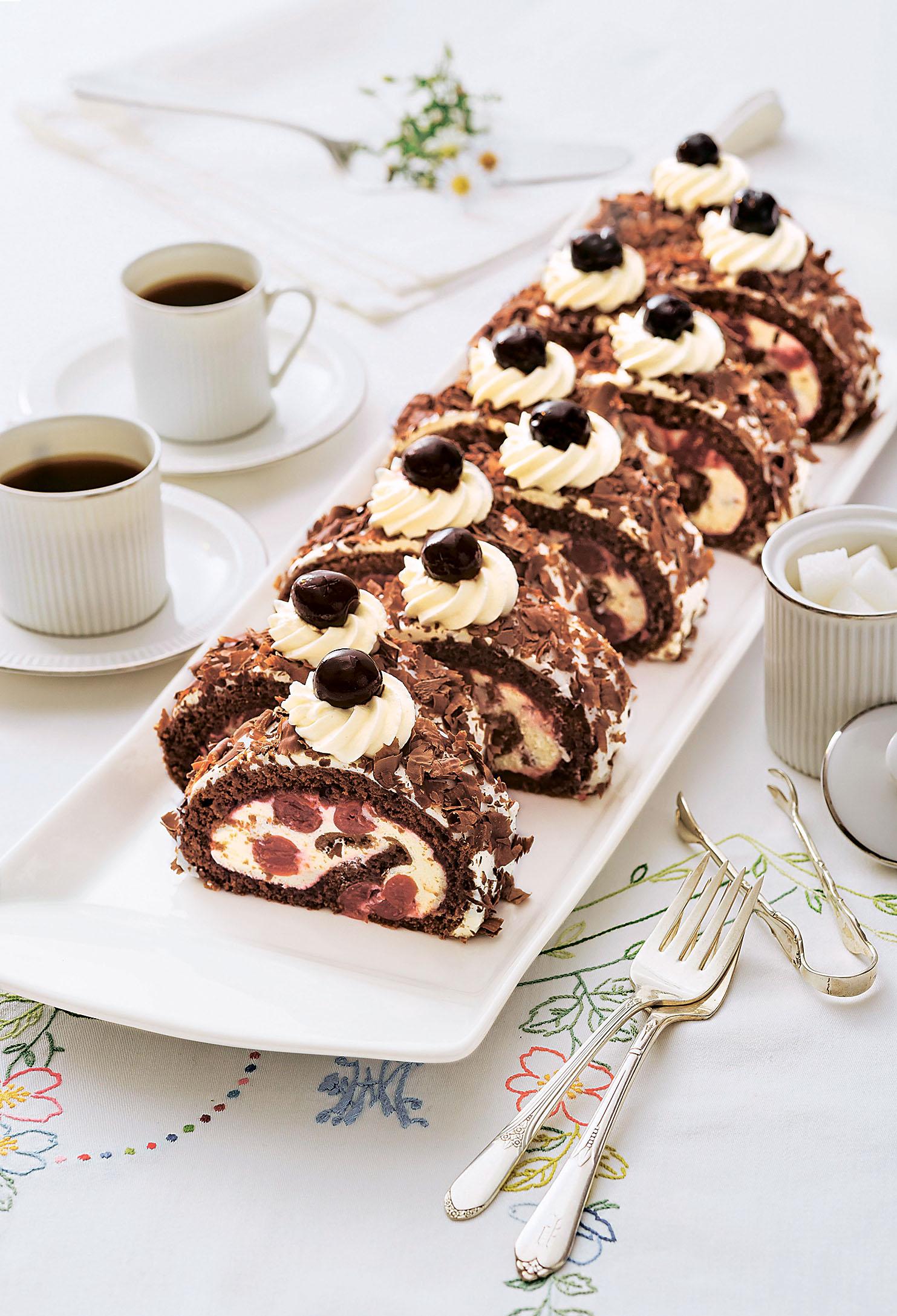 3. Бисквит развернуть и распределить по нему вишню. Выложить 3/4 сливок и свернуть рулетом. Верх покрыть оставшимися сливками и посыпать наструганным шоколадом. Убрать в холодильник на 1 ч.